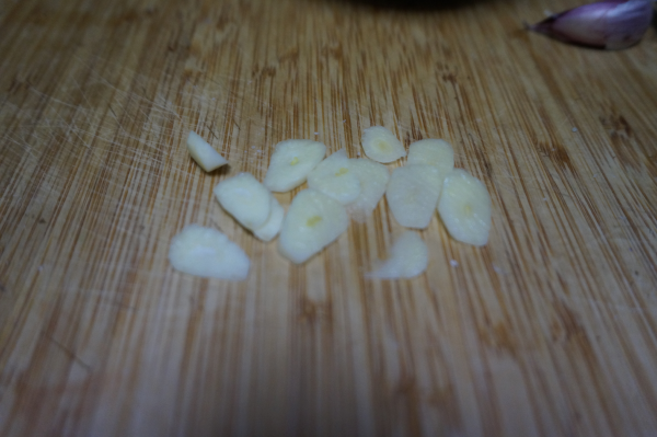 Preparación: Para preparar estas tostadas de angulas sucedáneas con gambas, empezaremos cortando los ajos. Ponemos una sartén al fuego con un chorro de aceite, lo tendremos a fuego medio. Añadimos los ajos laminados.