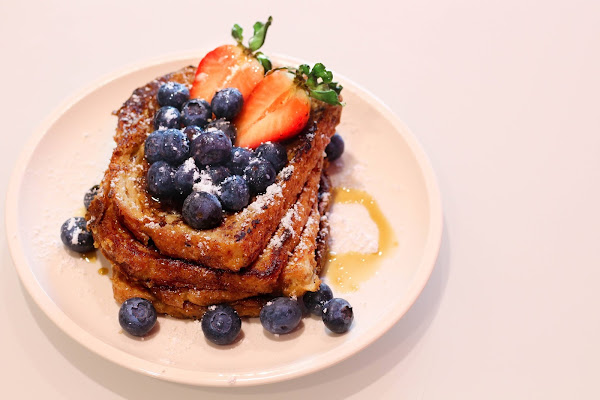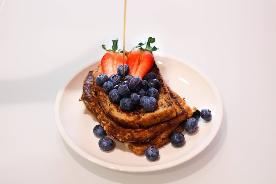 Ponemos los arándanos frescos y las fresas por encima y vertemos una cucharada generosa de sirope de arce por encima.