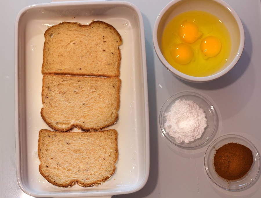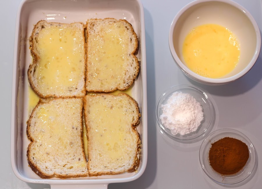 3. Batimos los 3 huevos y los vertemos por encima de las tostadas empapadas en leche. Cubrimos bien toda la superficie, volteamos y vertemos sobre el otro lado. Deben quedar bien cubiertas de huevo.
