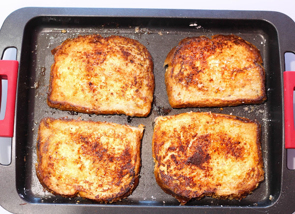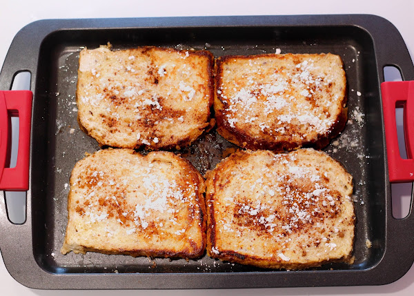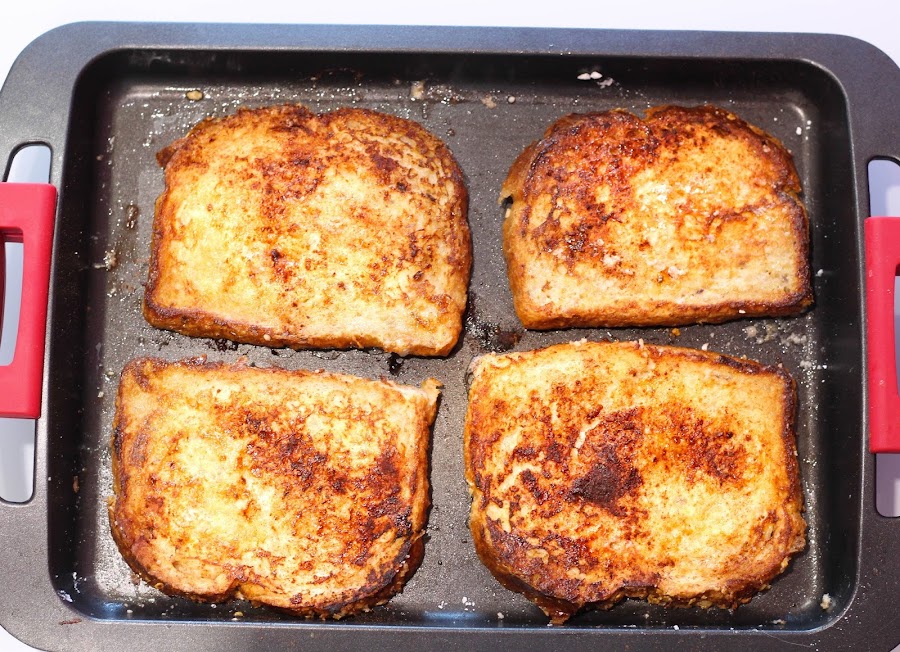 5. Pasados 5 minutos damos la vuelta a las tostadas. Habrán empezado a tomar un color doradito tan característico que las hace apetecibles. Añadimos otra pizca de canela y de azúcar glass.