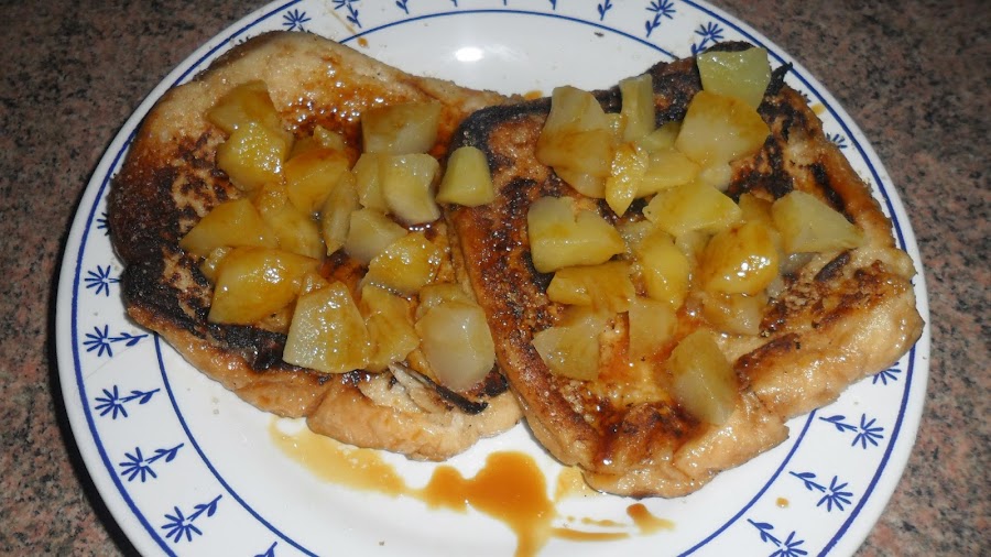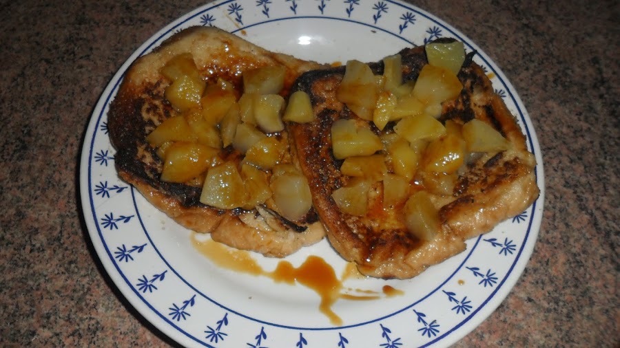 Emplatamos cada tostada francesa, con una buena ración de manzanas caramelizadas y bañamos con miel de palma o miel de flores y espolvoreamos con canela o azúcar glass y a disfrutarlas.