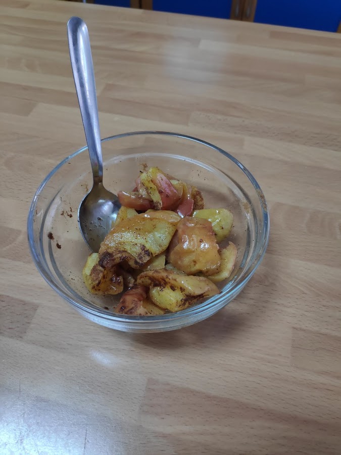 Pasado ese tiempo, comprobamos con un cuchillo si la manzana está blandita, si aún está dura, repetimos el paso anterior y volvemos a comprobar. Seguimos con este paso hasta que la manzana esté asada y blandita.