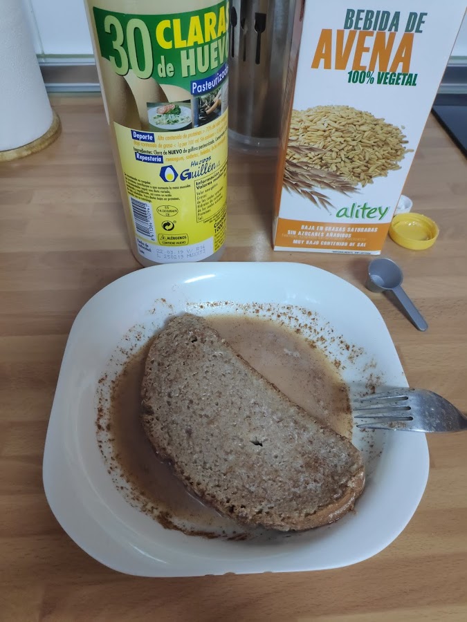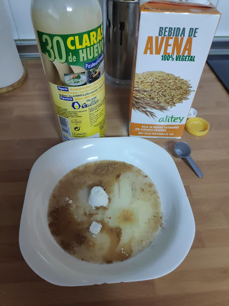 Mientras la manzana se asa, en un plato hondo, pondremos las claras, la leche y la proteína. En este paso yo también añadí una pizca de canela, pero es opcional y recomendable para los amantes de la canela como yo. Lo mezclamos bien con ayuda de un tenedor y vamos metiendo las rebanadas de pan en esta mezcla y dejando que se empapen bien.
