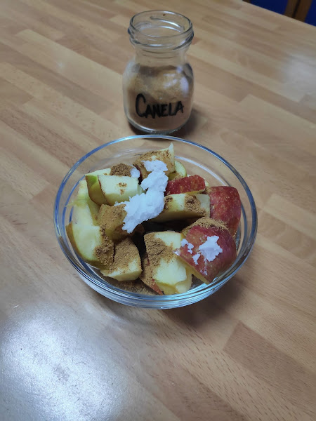 Para empezar, lavamos bien la manzana y la troceamos en cubos de más o menos el mismo tamaño. La ponemos en un cuenco donde también añadiremos la canela y el aceite de coco o de oliva.