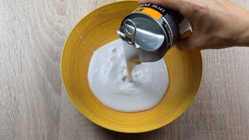 En primer lugar, cascamos un huevo en un plato y lo batimos bien. Si quieres que esta receta tenga menos calorías, puedes usar sólo claras en vez del huevo entero.En otro plato aparte, echamos la leche de coco y mezclamos con un tenedor para integrar la parte líquida de la sólida. Puedes usar leche animal o cualquier otra bebida vegetal como bebida de soja, bebida de avena…la que más te guste.