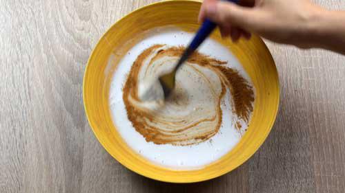 A continuación, agregamos a la leche media cucharadita de canela en polvo, un chorrito de esencia de vainilla y unas gotitas de estevia líquida, aunque puedes sustituir esta por cualquier otro tipo de endulzante que te guste, o simplemente no agregar edulcorante ninguno. Mezclamos todo hasta integral.