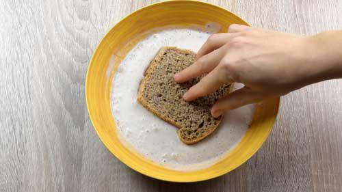 Ahora, tomamos una rebanada de pan y la pasamos primero por la leche, dándole la vuelta para que se empape bien por ambas caras.