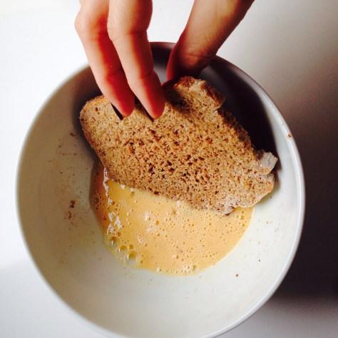 Lo mezclamos bien y empapamos las tostadas ( yo he puesto mis rebanadas de pan caser integral)