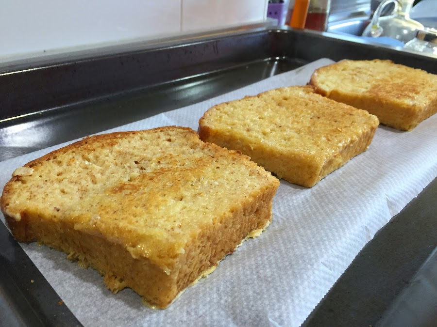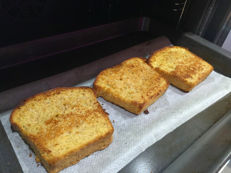 1. Preparamos el pan de molde el día anterior, aquí os dejo el enlace de la receta. Una vez echo cortamos 3 rebanadas de 1"5 de grosor, las ponemos en un plato dentro de un lugar cerrado y las reservamos para el día siguiente.