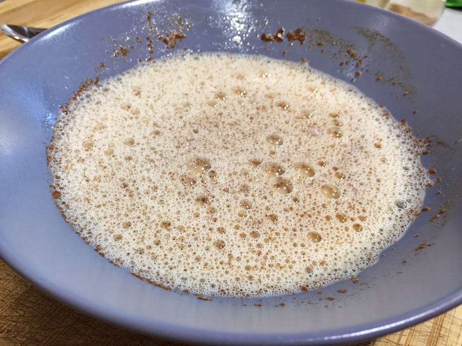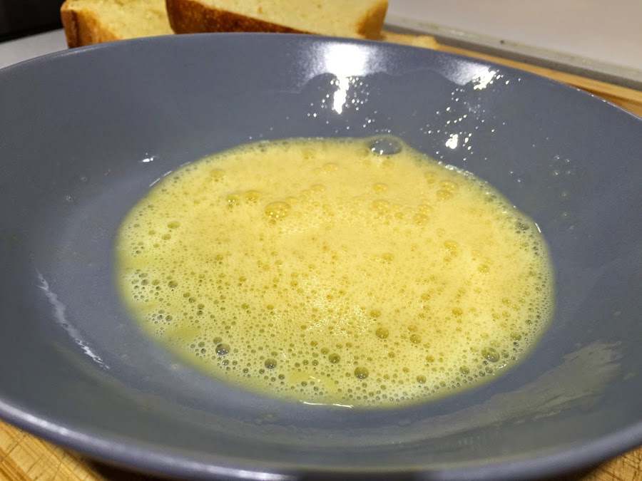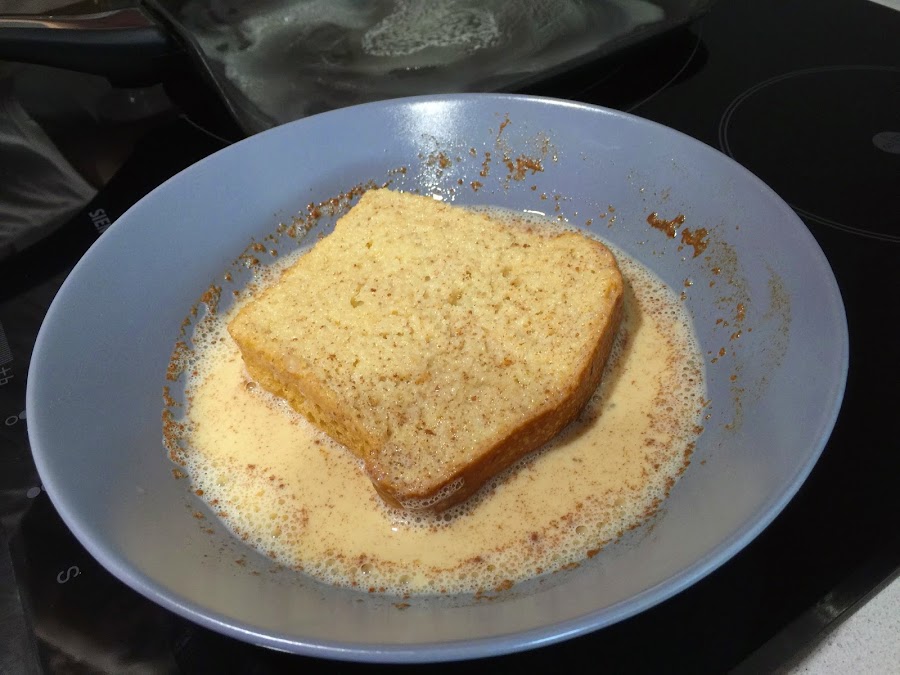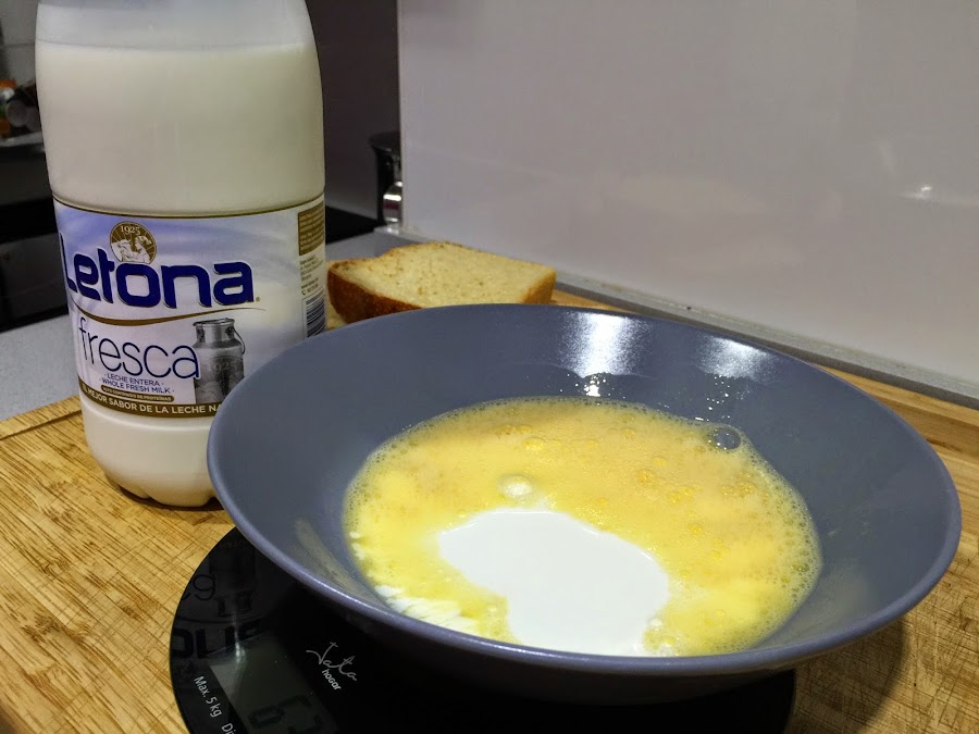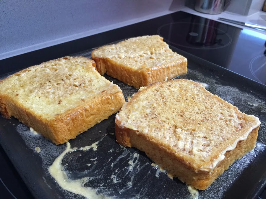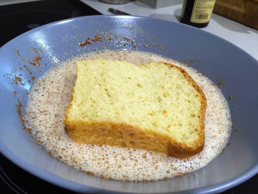 3. Colocamos las rebanadas de pan encima del líquido. Las dejamos reposar 1 o 2 por cada lado, para que absorban bien todo el líquido.