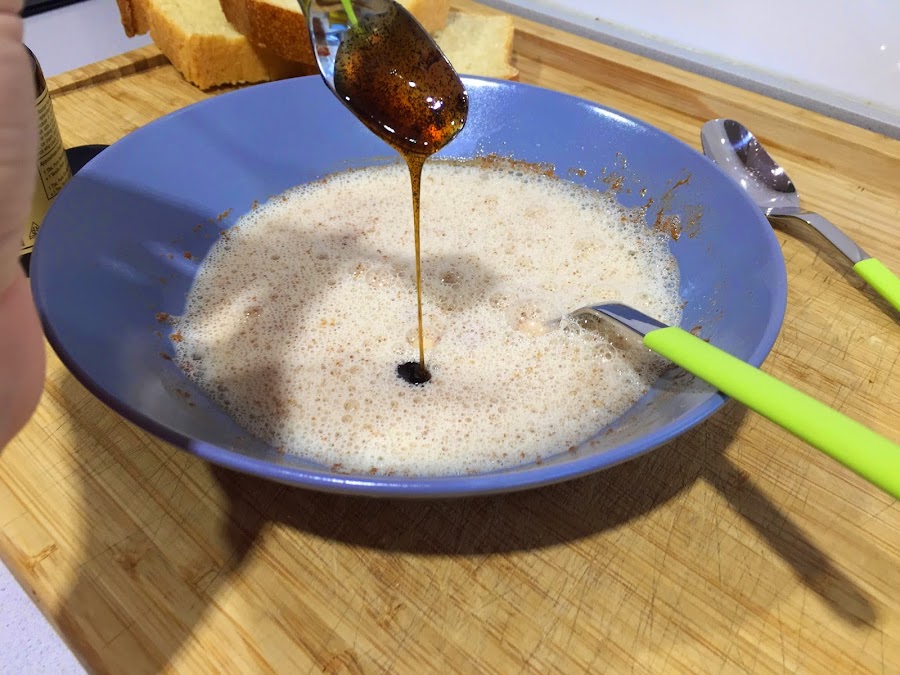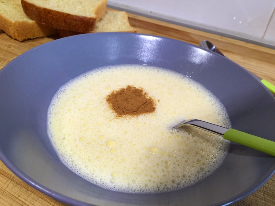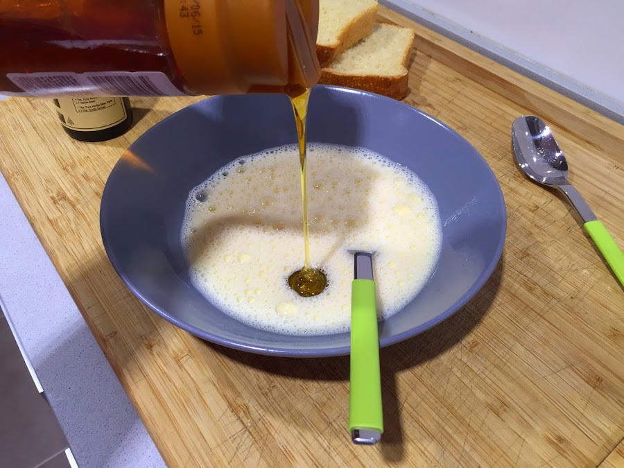 2. Precalentamos el horno a 180ºC. Preparamos la mezcla para humedecer las tostadas. Ponemos en un plato el huevo, la leche, la miel, la canela y la vainilla y batimos bien.