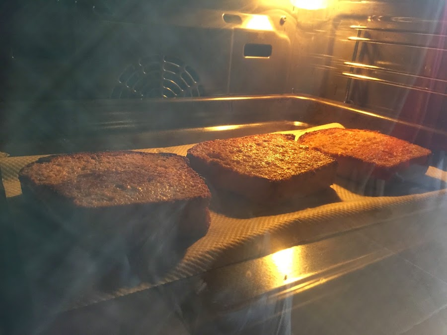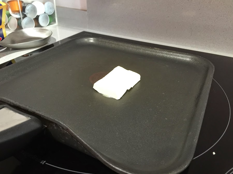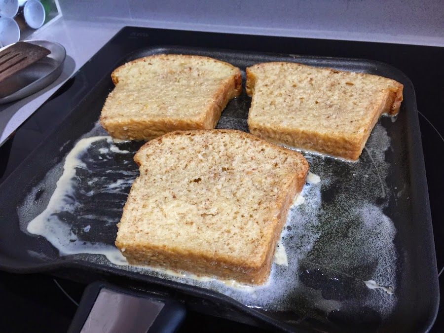 4. Ponemos la mantequilla en la sartén y calentamos hasta que se derrita. Ponemos las tres tostadas encima a temperatura media y sellamos 2 minutos por cada lado. No deben quedar doradas, solo se trata de que quede sellado el exterior para retener el líquido dentro y que queden bien jugosas.
