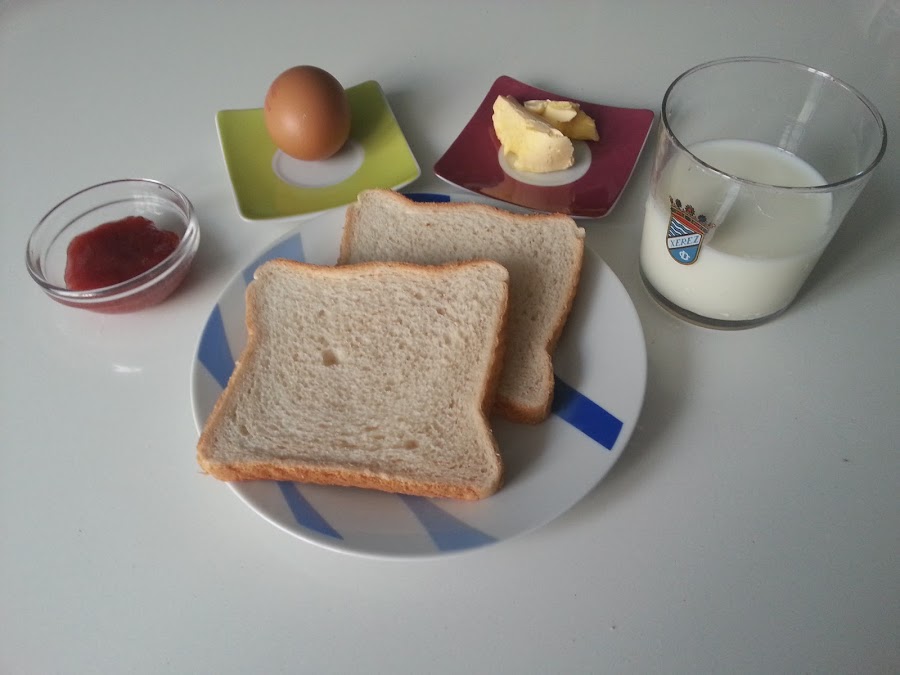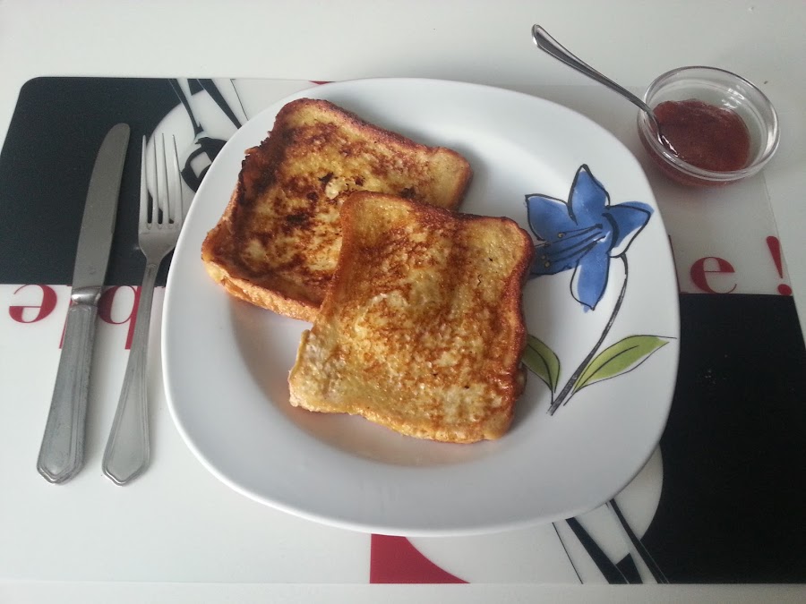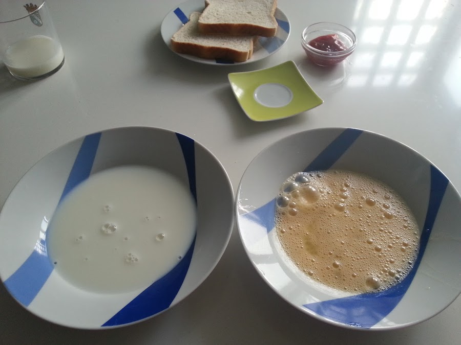 1. - En primer lugar batimos los huevos en un plato hondo. En otro plato ponemos la leche. Si queréis podéis añadirle una o dos cucharadas de azúcar, pero yo, como iba a ponerlas con mermelada, no le añadí nada.