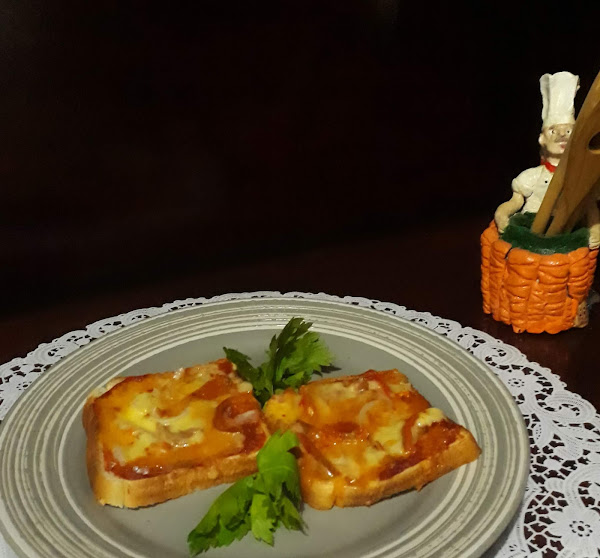 En un tazón mezcle la mantequilla,ajo,pimienta,orégano con esto barnizar las rebanadas de pan cuadrado,llevar al horno en broil a apenas dorar, ya listo sacar,mezclar salsa de tomate,aceite de oliva y azúcar,colocar en las rebanadas de pan salsa de tomate,jamón,hongos y queso volver al horno hasta gratinar.