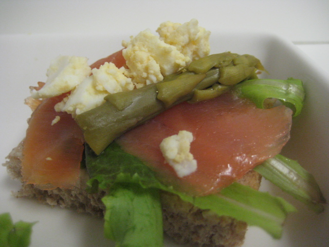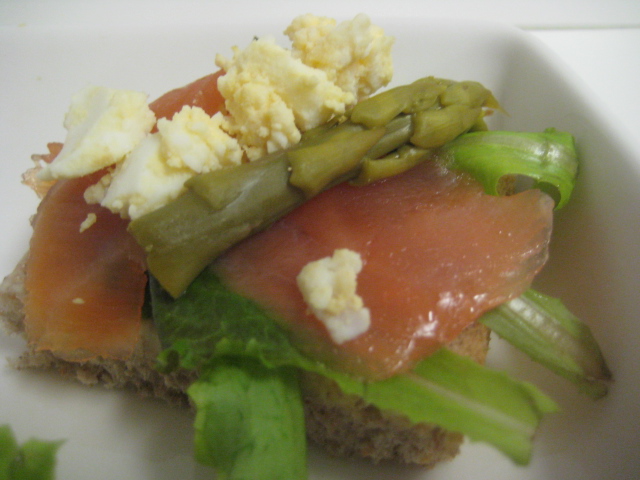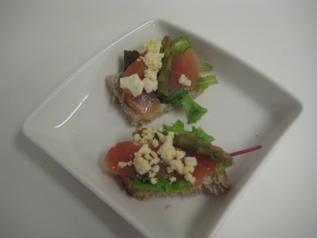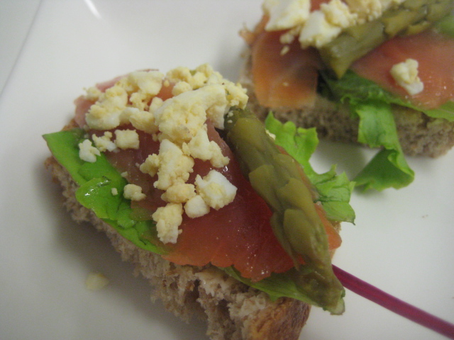 Preparación: Cocer, saltear o escurrir bien las puntas de espárragos y cortar para emplear sólo lo más tierno. Reservar. Cortar el salmón a la medida de las tostaditas. En un bol mezclar la mayonesa, la nata (crema de leche), eneldo picado, sal, pimienta y un poco de cebolla picadita o en polvo, que le aporta el gusto, pero no lo molesto de la cebolla. Con esta salsa untar ligeramente cada una de las tostaditas de pan. Luego poner un poco de brotes de ensalada y un par de laminas de pepinillos agridulces. Colocar luego el salmón y encima de éste un poco de huevo duro picado y unas puntas de trigueros. Servir el resto de la salsa nata (crema de leche), mayonesa y eneldo aparte para que cada uno pueda ponerse un poco más sobre la tostada