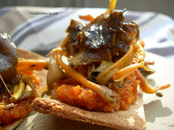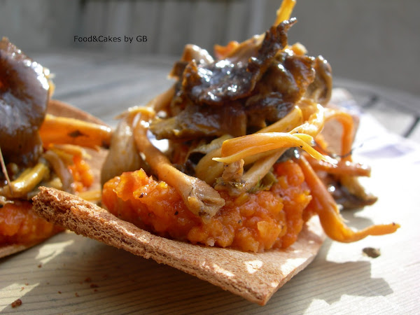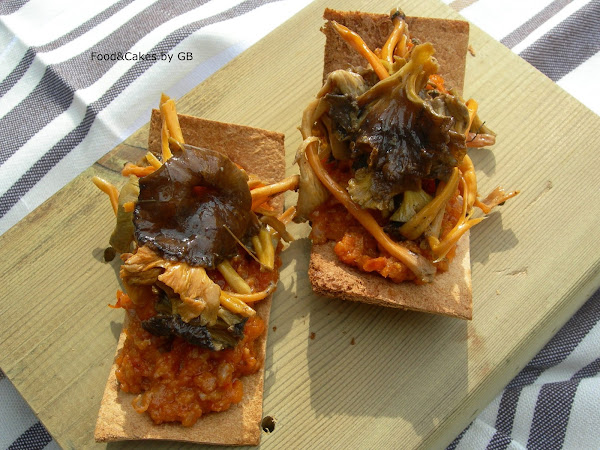 Montamos el plato, poniendo las tostas, unas cucharadas de salsa por encima y al final las setas.