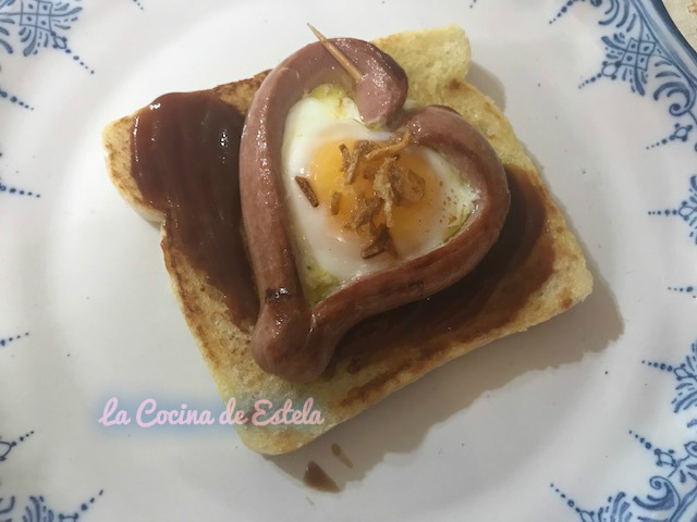 -Ponemos una sarten antiadherente con un dedo de aceite de oliva virgen a calentar. Cuando esté caliente ponemos el corazón de salchicha y doramos de un lado y después del otro. Es ahora cuando ponemos el huevo en el centro del corazón y bajamos el fuego para que cuaje este, pero sin que se haga la yema, es igual que freír un huevo. Ayudándonos de la espumadera vas haciendo que el aceite cubra y haga el huevo. (Podemos tapar a fuego lento y se hara tambien)