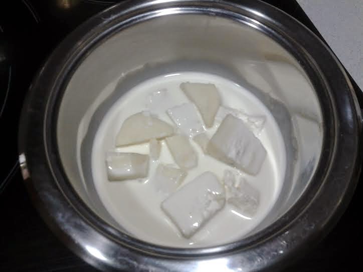 Tostas pequeñasPonemos el queso y la nata (crema de leche) en un cazo y lo llevamos al fuego hasta que el queso se derrita y tengamos una crema lisa y homogénea.