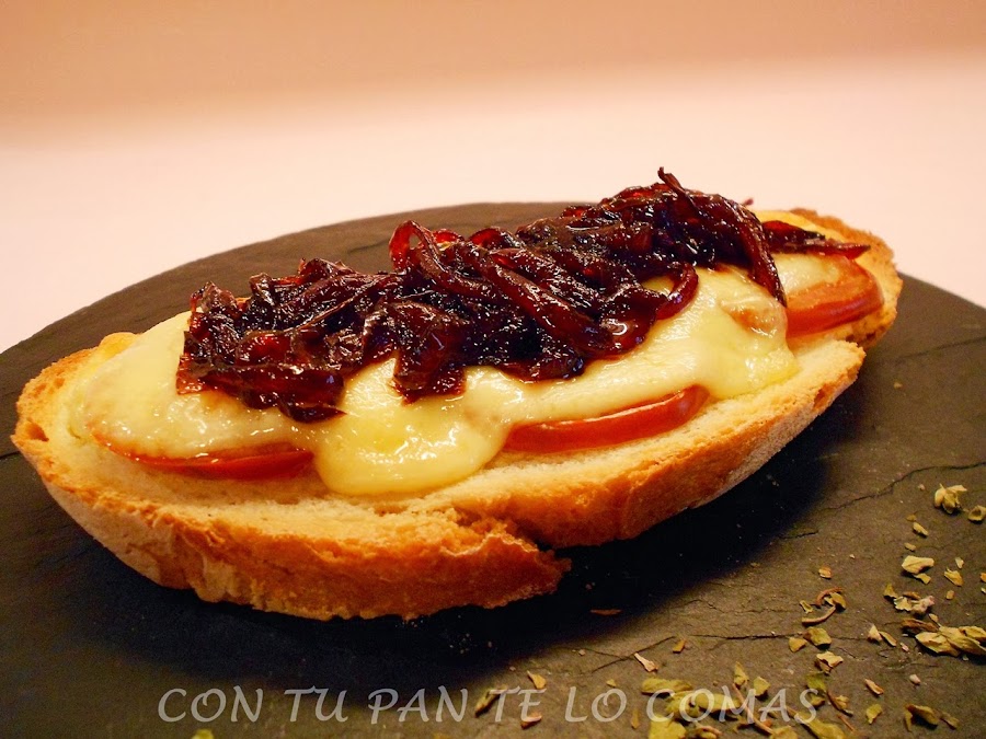 Si la cebolla se ha quedado fría la calentamos un momento y servimos las tostas con una cucharada de cebolla caramelizada encima del queso. Esto está buenísimo.