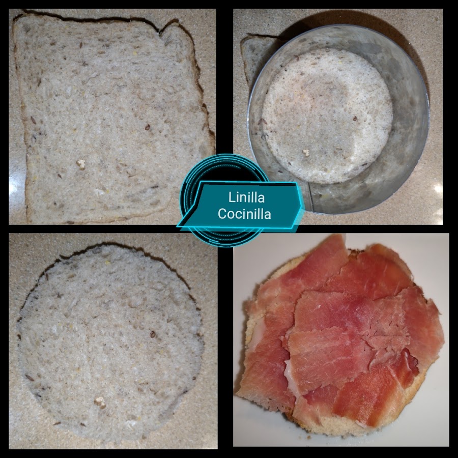 4. Prepare el pan para montar las tostas, corte las rebanadas con un cilindro y ponerlas a tostar en el horno o tostadora. Monte el jamón encima del pan y después distribuir las angulas sucedáneas sobre el pan y sirva inmediatamente.