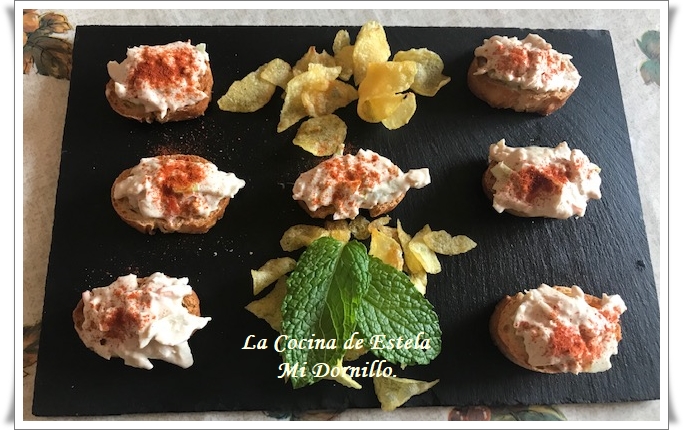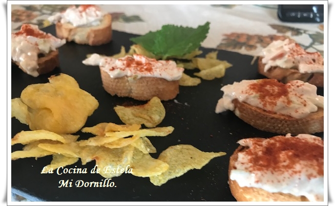 Vamos poniendo encima de cada rebanada una cucharadita bien llena de nuestra mezcla, espolvorear con el pimentón.