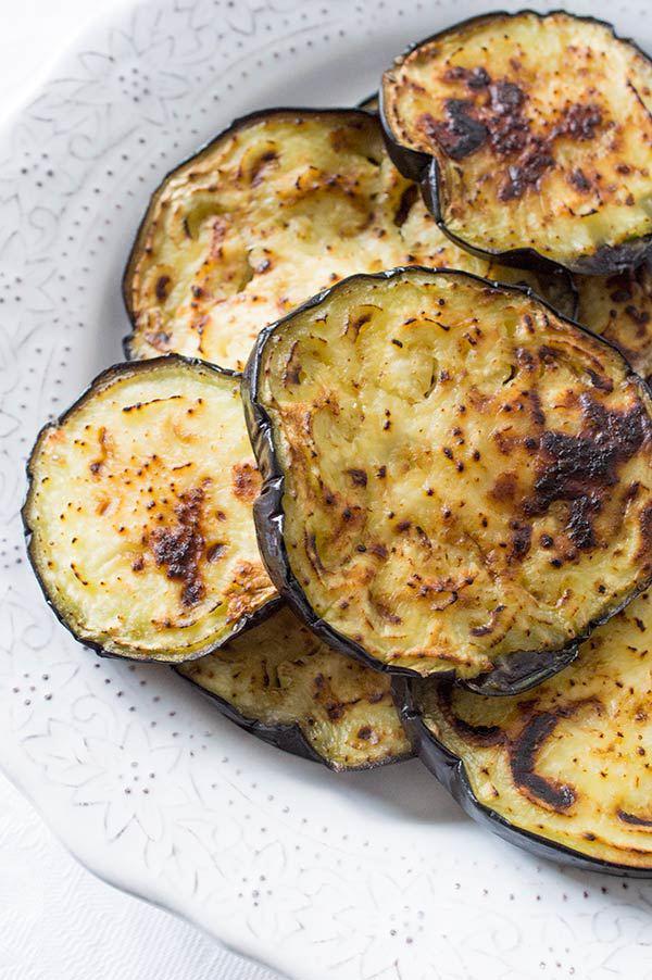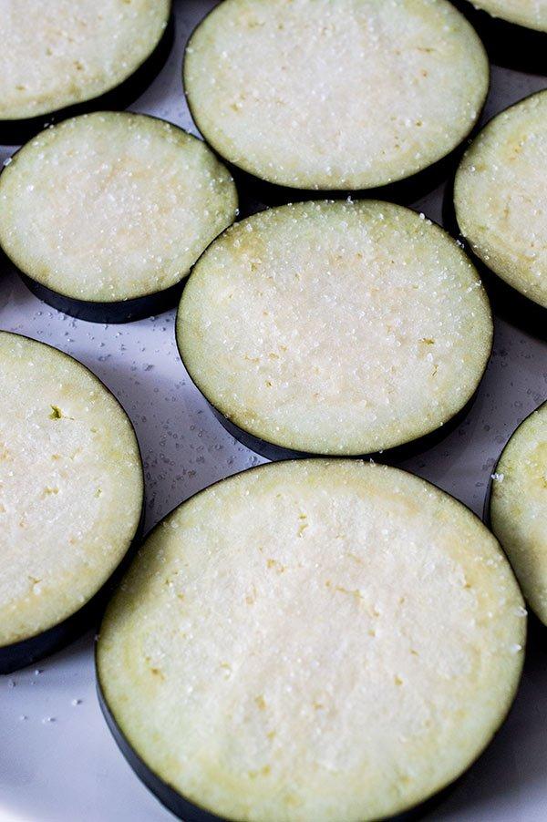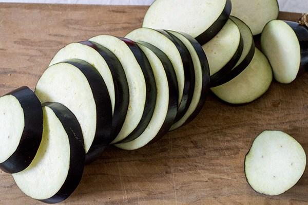 Lavamos y cortamos la berenjena en rodajas de medio centímetro.