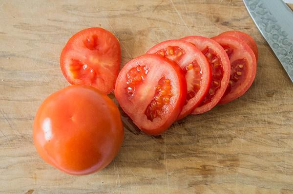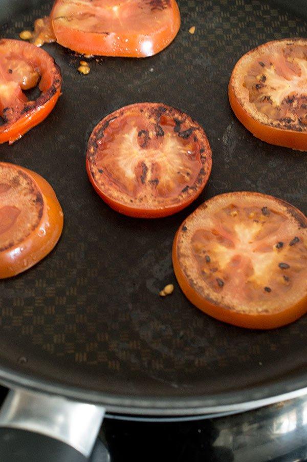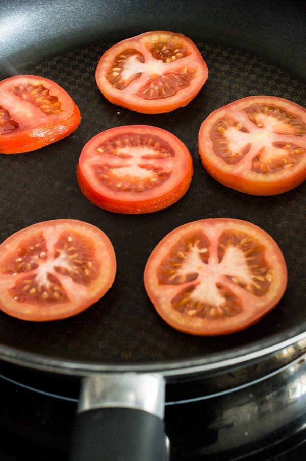 Cortamos el tomate también en rodajas y lo hacemos en la misma saeten hasta que este dorado por ambos lados. Reservamos.