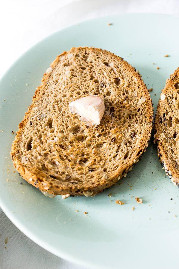 Cortamos el ajo por la mitad y le untamos el ajo. A continuación le añadimos un chorrito de aceite.