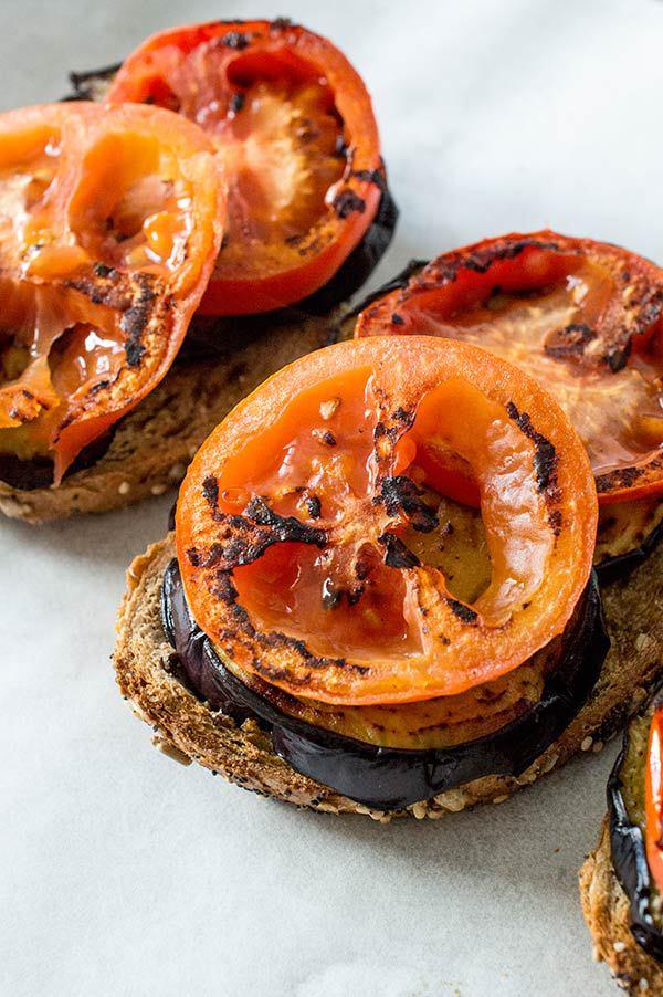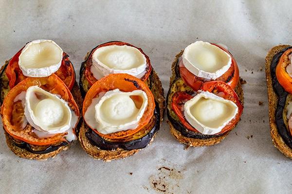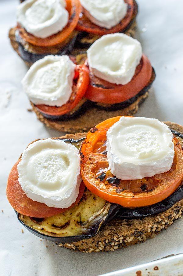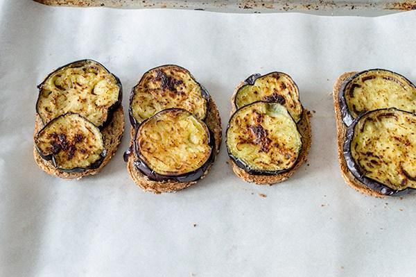 Ponemos un papel de horno sobre una bandeja y montamos las tostas, primero la berenjenas, los tomates,
