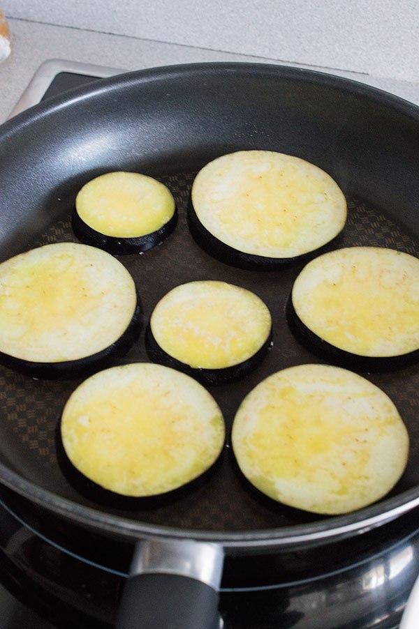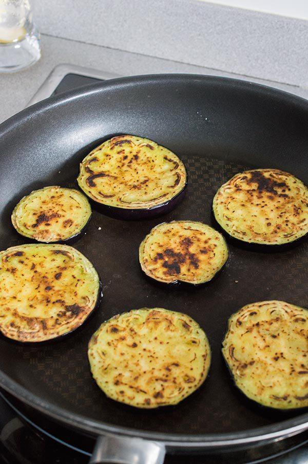 Calentamos una sartén a fuego fuerte y hacemos las berenjenas hasta que estén doradas por ambos lados. Las tapamos con una tapa para ayudar a que se hagan antes. Las reservamos.