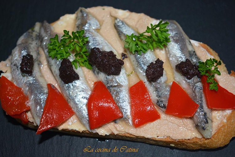 Untamos las rebanadas de pan por el lado no tostado con la mezcla de queso y paté de anchoas. Colocamos encima los boquerones y repartimos entre ellos los triángulos de pimiento.
