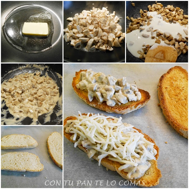 4. Tostar las rebanadas de pan en el horno (gratinador). Cubrir cada una con los champis y una buena cantidad de queso.