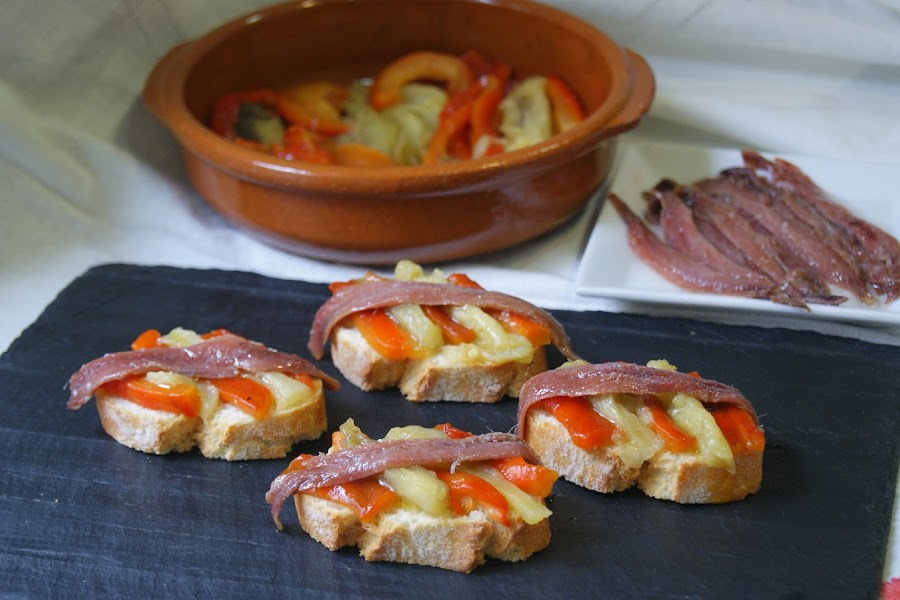 Para preparar las tostas, hay que cortar rebanadas de pan del día anterior y tostarlas en la tostadora o en el grill del horno. Se cortan tiras de berenjena y pimiento y se disponen encima del pan tostado. Encima de cada tosta se coloca uno o o dos filetes de anchoas en aceite. Se les echa un poco de sal y un chorrito generoso de buen aceite de oliva virgen exta. Se pueden servir como entrante, en picoteos, o como pinchos a cualquier hora del día.