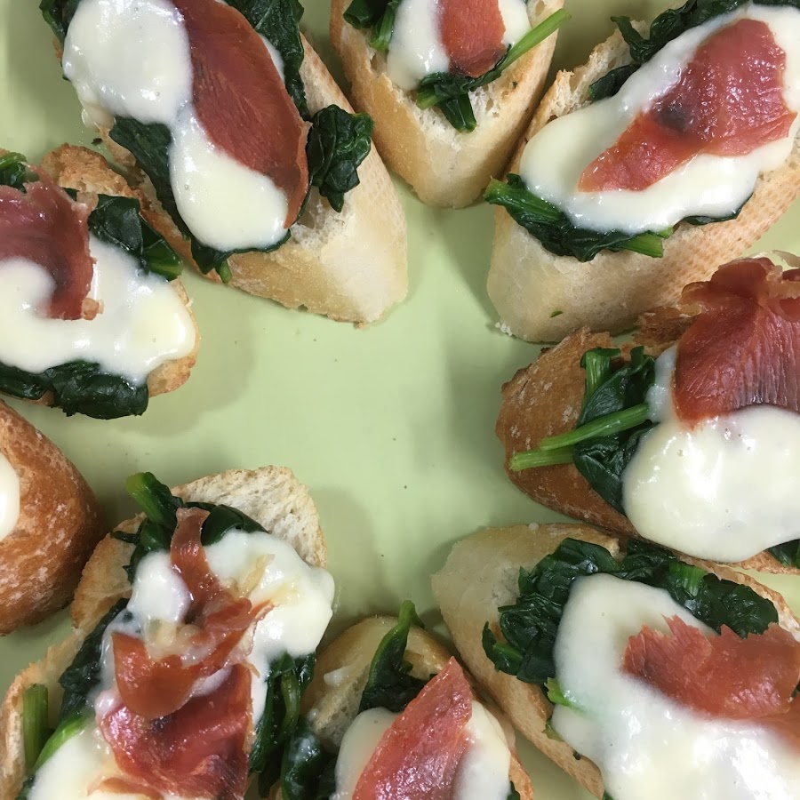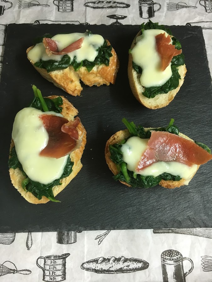 Se ponen encima de las rebanadas tostadas las espinacas escurridas y muy picadas, las crema de queso templada y un trocito de jamón.