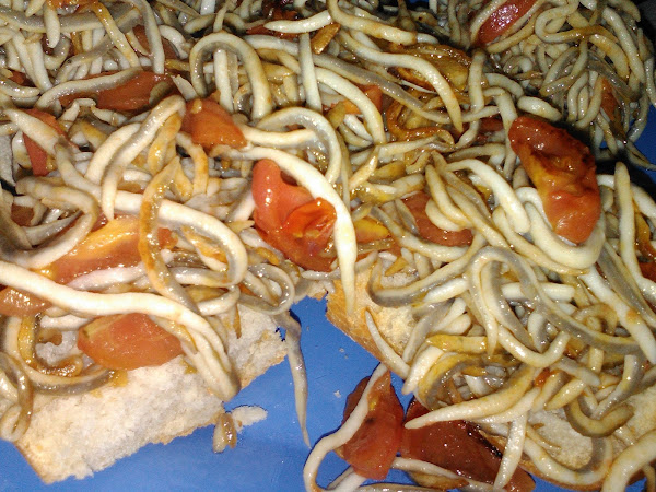 Dejamos que se cocinen un minuto y añadimos las angulas sucedáneas, salamos al gusto, retiramos las guindillas y colocamos la mezcla de angulas sucedáneas, ajo y cherry sobre el pan.