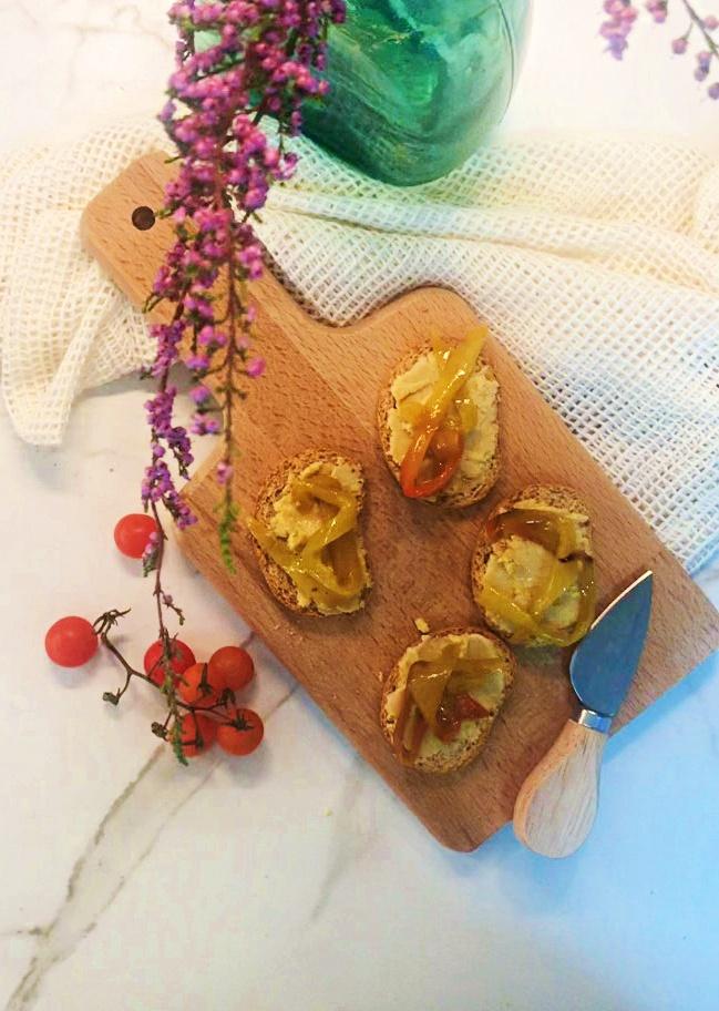 Trituramos todos los ingredientes del hummus y listo! Súper rápido y sencillo! Extendemos el hummus sobre las tostas y colocamos pimientos asados para decorar!Y ahora toca lo mejor! Disfrutarlo! Y mucho!
