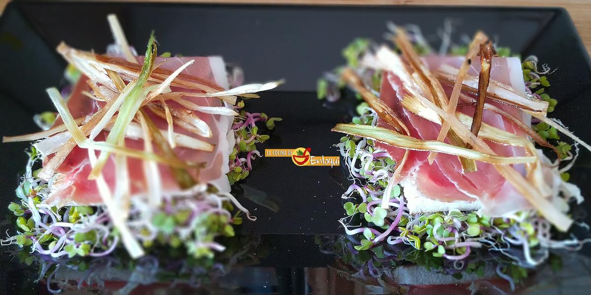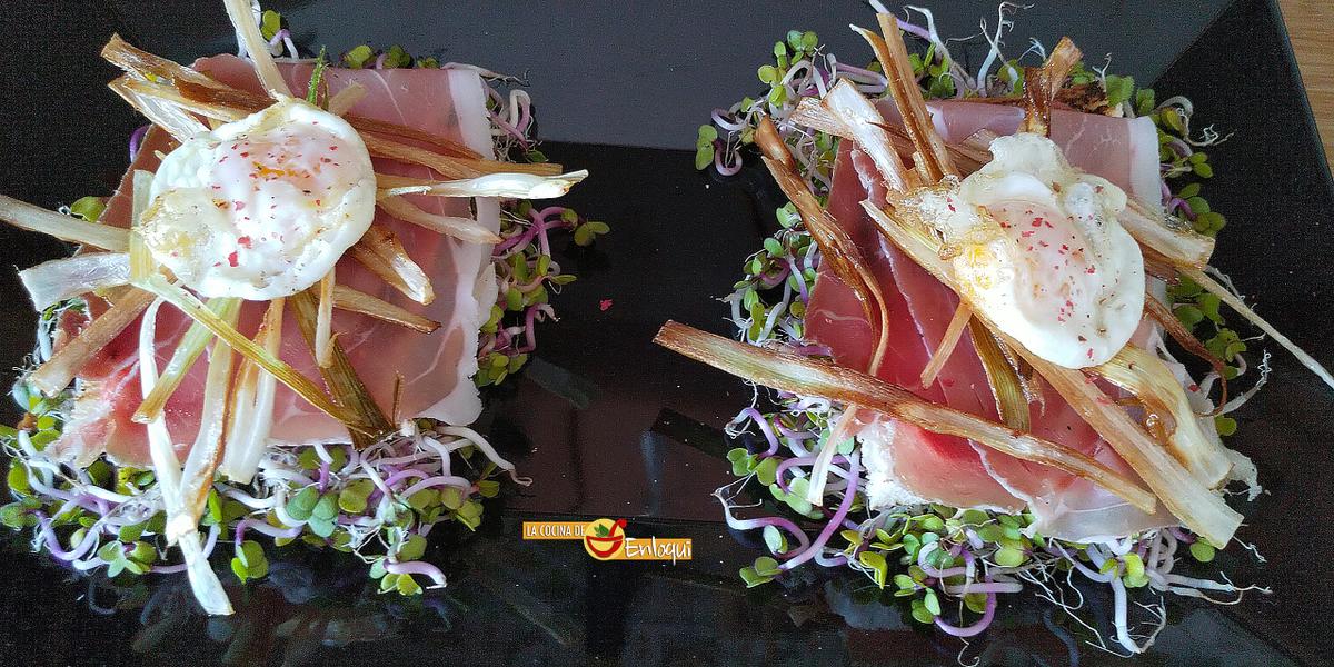 Siguiendo con nuestra propuesta de hoy, esta tosta es una explosión de sabor, además encuentras diferentes texturas y el resultado, colorido y vistoso, la hacen más apetecible aún. La presentación no tiene desperdicio ya que hemos hecho una cama con brotes de rabanitos que le dan un toquecillo picante muy sutil. Las virutas fritas crujientes de puerro aportan un sabor y una textura que las convierte en la alegría de la tosta, pero lo mejor de todo, como no podría ser de otra manera es el jamón. Si añades unas lonchas finitas de jamón ibérico pasarás de nivel, cada bocado te transportará al paraíso. Y como cada pastel tiene su guinda, al aperitivo de hoy le colocamos unos huevitos fritos de codorniz, si lo prefieres puedes hacerlos poché.