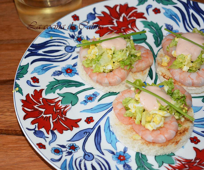 Colocamos dos langostinos en cada rebanada de pan, formando un círculo y rellenamos el hueco con la mezcla de huevo y lechuga.