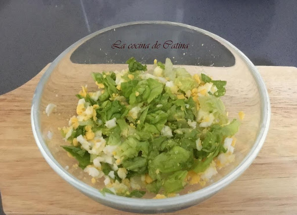 Lavamos la lechuga y la cortamos en juliana muy fina. Picamos los huevos y los mezclamos con la lechuga.