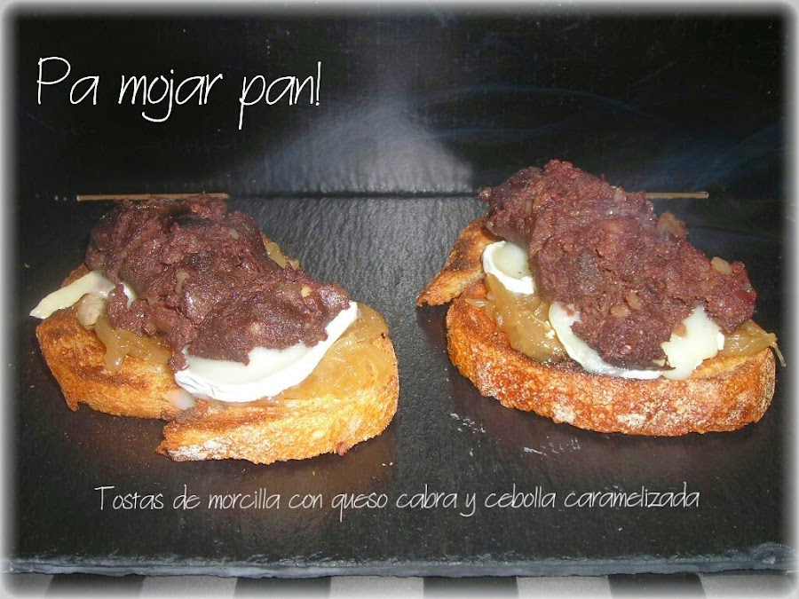 Ahora solo nos queda montar nuestro pinchito. Sobre cada tostada ponemos un poco de cebolla caramelizada. Sobre ésta colocamos el queso de cabra caliente y por encima un poco de la morcilla desmenuzada que teníamos reservada.