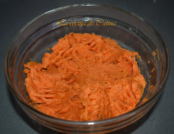 Ahora, tenemos 2 opciones: o cocemos los boniatos partidos en trozos o los asamos una vez bien lavados. Cuando los tengamos asados o cocidos (alrededor de 20 minutos), les quitamos la piel y los hacemos puré chafándolos con un tenedor.