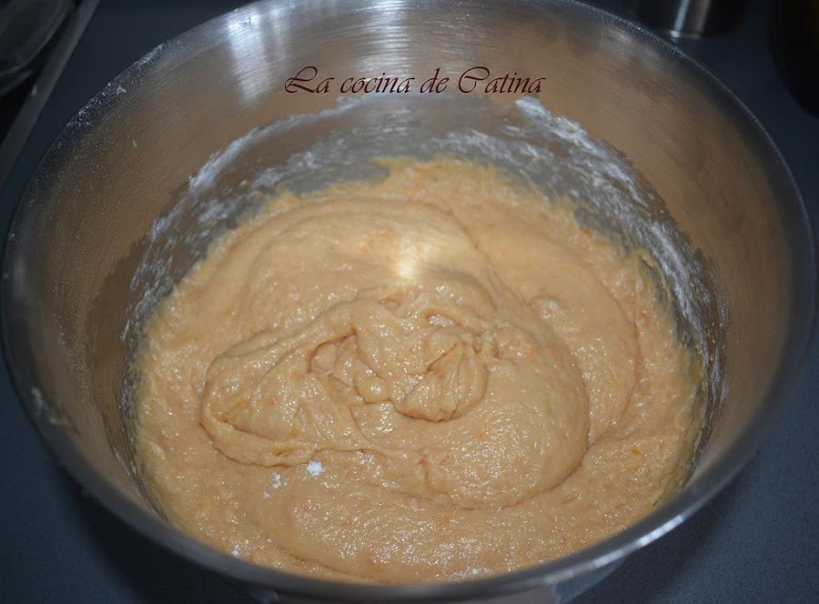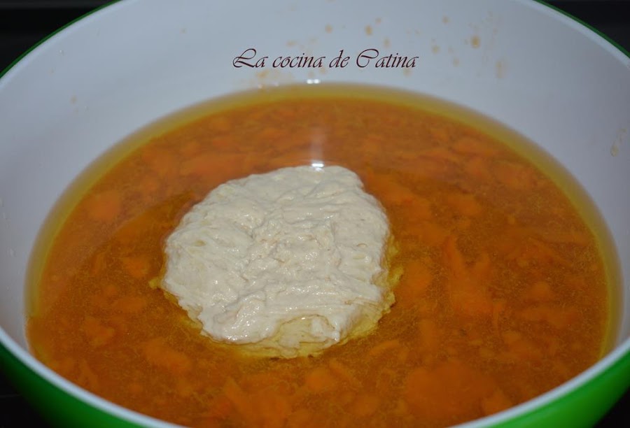 En el robot amasador con los ganchos de amasar ponemos la mezcla anterior junto con la masa madre o de creciente y vamos añadiendo poco a poco la cantidad de harina necesaria para que obtengamos una bola de masa que se despegue de las manos fácilmente.Dejamos que la masa del bizcocho de mosto crezca poniéndola en un sitio cálido cubierta con papel film para evitar que se seque, aproximadamente durante un par de horas.