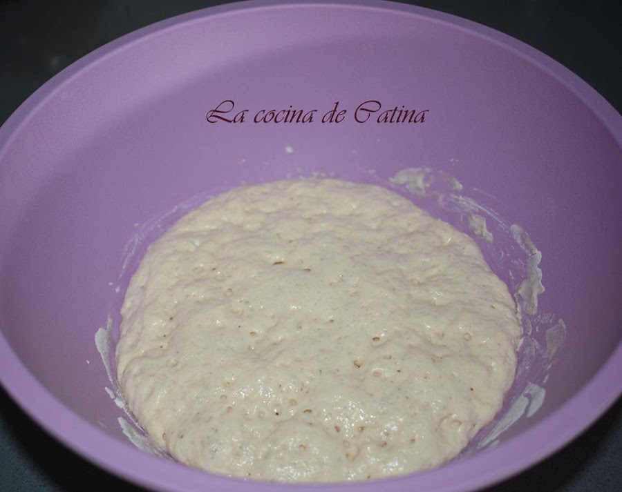 Ya mezclados, añadimos nuestra masa de creciente y vamos añadiendo harina poco a poco hasta conseguir una masa que se nos despegue de las manos (la masa la podemos hacer a mano o con un robot amasador). Una vez conseguida la masa, la dejamos levar cubierta con film de plástico en un sitio cálido, aproximadamente un par de horas.