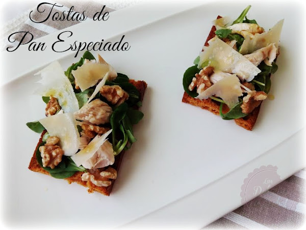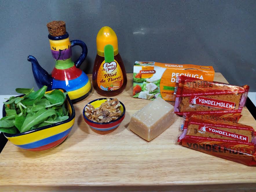 Una vez todo preparado, sólo nos queda el montaje. Colocamos sobre la rebanada de pan un poco de rúcula y canónigos, unos trocitos de pollo, las nueces y el queso. Echamos un chorrito de la emulsión de aceite y miel por encima y listo.