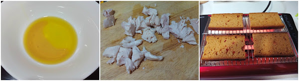 Preparamos una emulsión con el aceite y la miel y reservamos. Sacamos el pollo, lo troceamos y reservamos. Picamos un poco las nueces, sacamos lascas de parmesano y tostamos el pan un poquito para que quede crujiente.