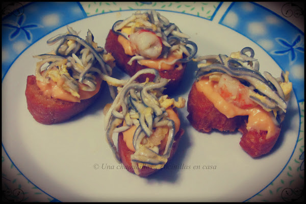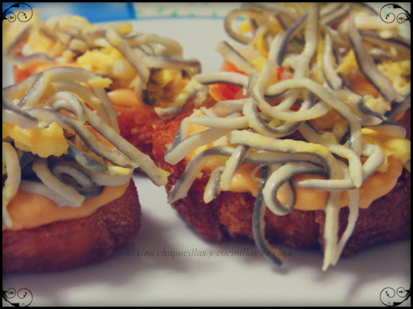 Bueno, como ya se van acercando las fechas navideñas y muchas veces estamos ya cansados de repetir los mismos pintxos y entrantes yo os traigo esta opción a ver que os parece, a mi me gusta mucho, pero claro es que lleva pan frito y a mi me chifla su sabor, lo combinaría con cualquier cosa, pero no es bueno abusar mucho de los fritos.