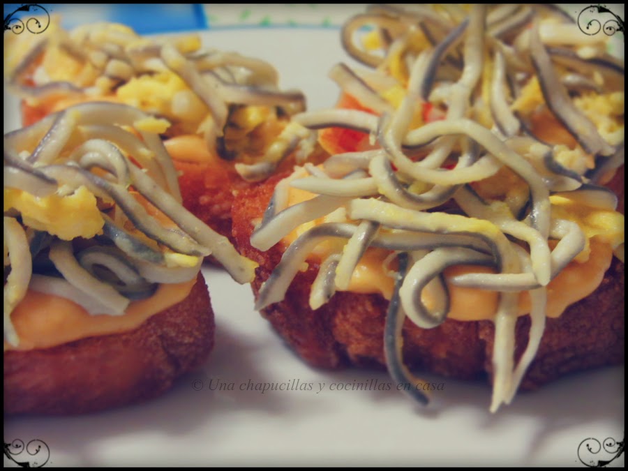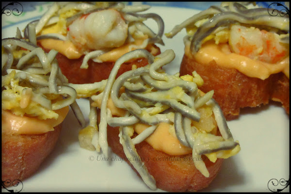 RECETA DE TOSTAS DE PAN FRITO CON REVUELTO DE angulas sucedáneas