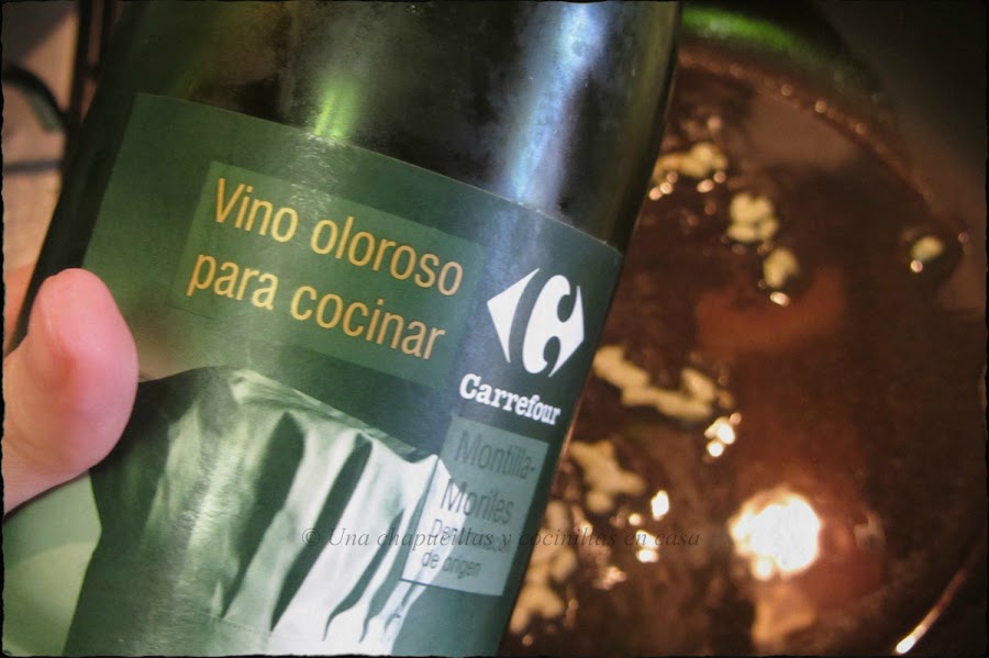 Agregar medio vasito aproximadamente del vino y dejar reducir unos minutos.