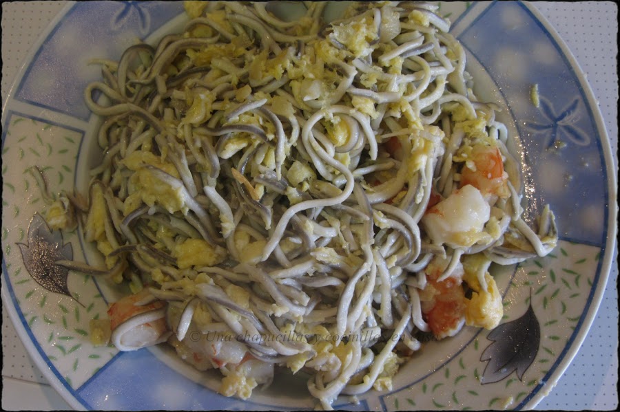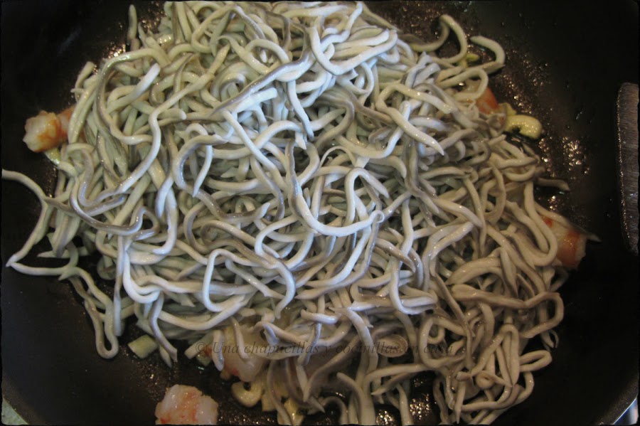 Agregar ahora las angulas sucedáneas. Echar sal al gusto, no demasiada porque ya traen sal.