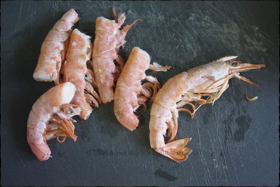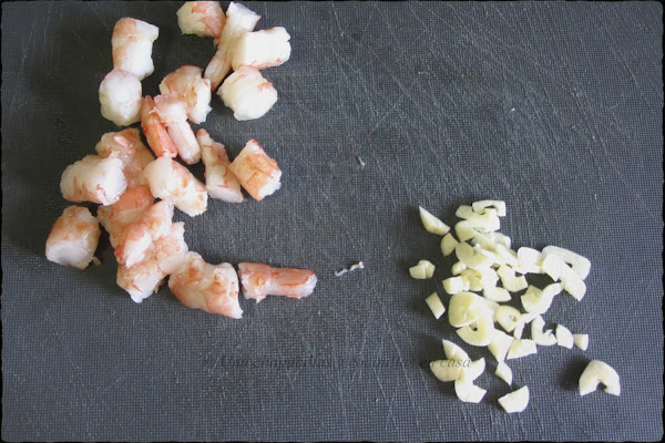 Lo primero pelar los gambones y trocearlos. Picar tambien un diente de ajo.